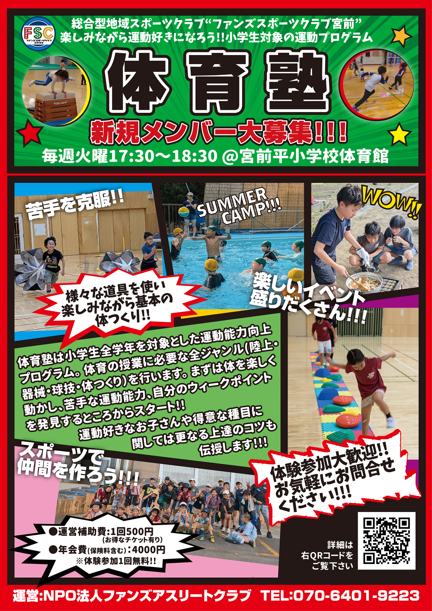 毎週火曜日17:30~18:30宮前平小学校体育館で行っている小学生対象の総合体育教室「体育塾」